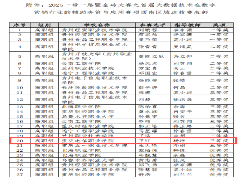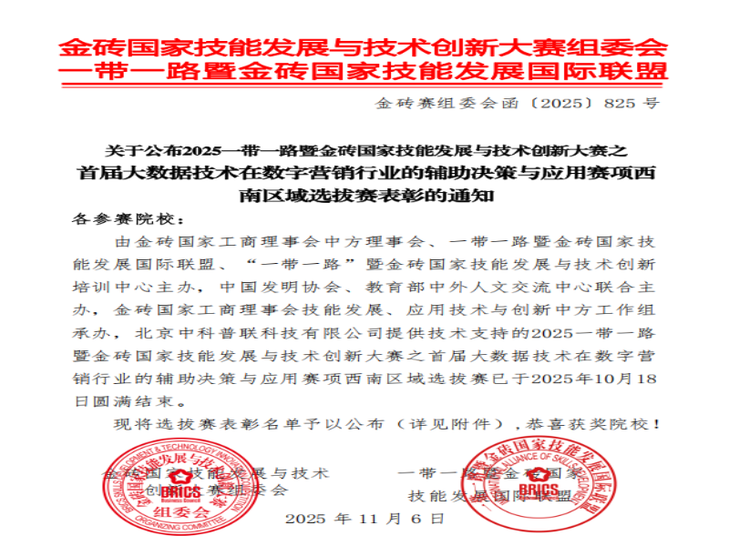 近日,由金砖国家工商理事会中方理事会、一带一路暨金砖国家技能发展国际联盟等单位联合主办的2025一带一路暨金砖国家技能发展与技术创新大赛——首届大数据技术在数字营销行业的辅助决策与应用赛项西南区域选拔赛圆满落幕。由我院教师杨洋指导的2023级大数据技术专业2班学生王江在比赛中表现优异,荣获高职组三等奖。